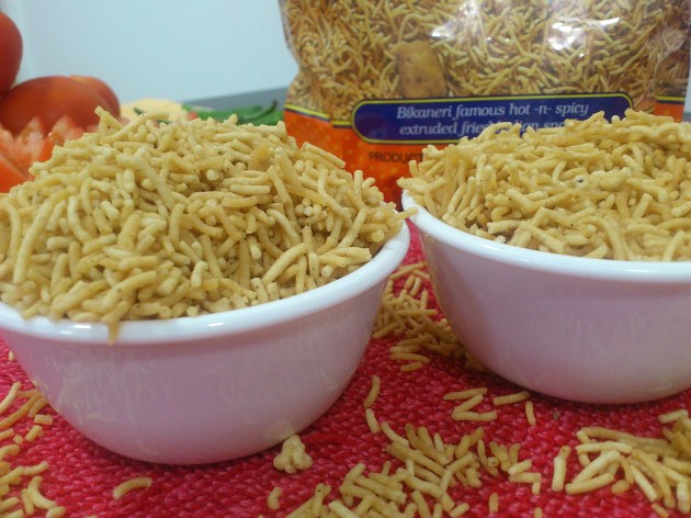 The crisp sev is a perfect complement to the succulent tomatoes. I prefer the spicy bhujiya sev available in the market. You can also use the non-spicy sev if you don’t like your food very spicy.