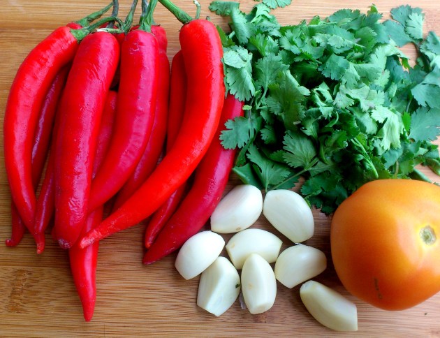 Grind the chillies, garlic, tomato, lime juice, sugar, and salt to a very coarse paste. Add the chopped coriander and grind again to a coarse paste. Store covered in fridge. This chutney can be served as a dip with snacks or as a side dish with any meals.