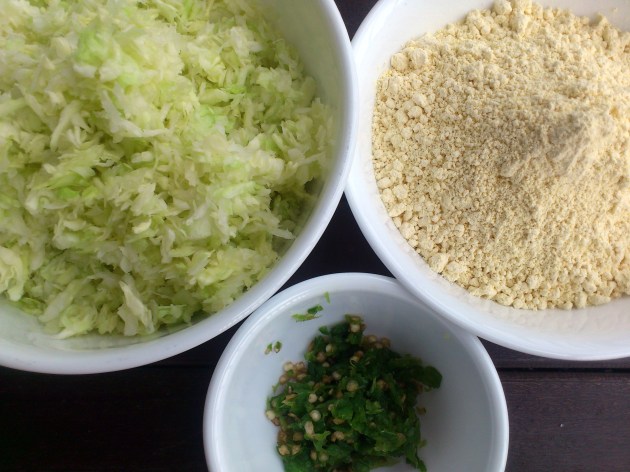Heat oil in a thick bottomed pan or non-stick pan. Add the gram flour and roast it on a slow flame mixing continuously till it is slightly brownish (2-3 minutes) in color. Do not over roast it. It will taste bitter otherwise. Add green chillies paste and roast again for 1 minute. Add the cabbage, salt, chilli powder, garam masala, turmeric powder, lime juice, and chopped coriander. Mix well and roast for another 3-4 minutes. Remove from heat and let it cool completely.