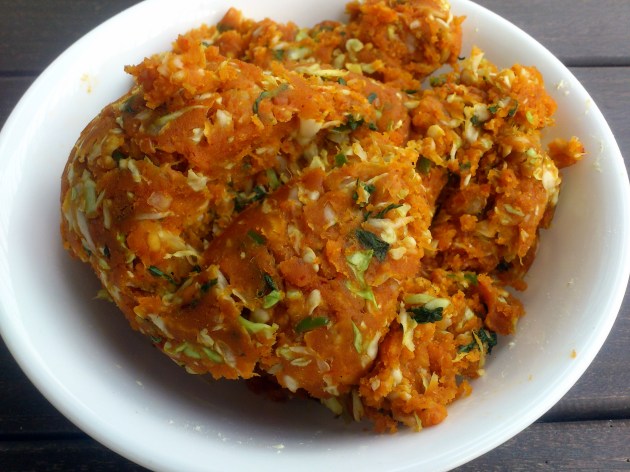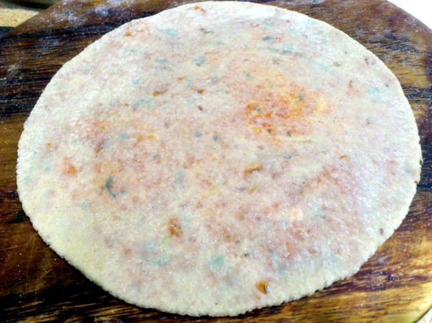 Divide the dough into equal portions. Roll out a thick small disc (appx 5 inches). Put a portion of the cooled filling (appx 1-11/2 tbsp) in the center and bring the edges together to form a small ball. Flatten it lightly with hand and roll into a paratha. Try not to let the filling out while rolling the paratha.