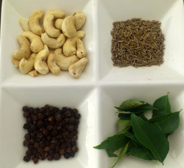 Heat ghee in a pan. Add cumin seeds. Once the seeds pop, add curry leaves and asafoetida. Add peppercorns and cashew nuts and sauté till the cashews are lightly browned.