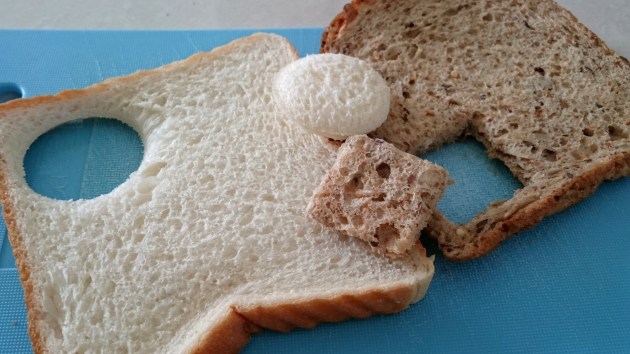 Cut the bread into bite sized pieces in desired shapes. I used cookie cutters to cut the bread into bite sized circles and squares.