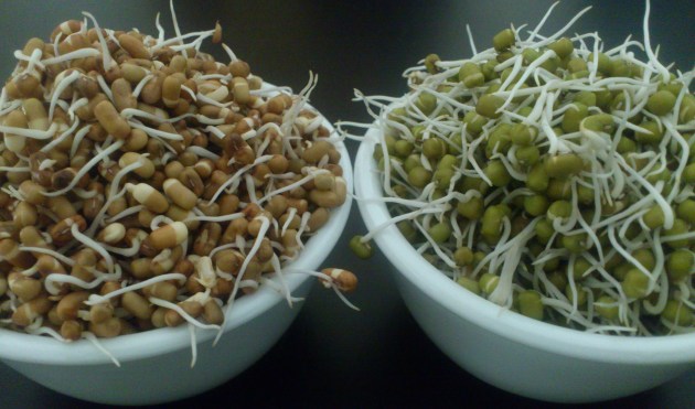 I have used moong and moth beans sprouts. You can try using alfalfa beans, chickpeas, radish, or even soya beans. Making sprouts at home is very easy. Just soak the moong and moth beans in water overnight. Next day, drain the water and tie the beans in a wet kitchen towel. Keep these tied sprouts in a covered container overnight and you have the sprouts ready. If you want the beans to sprout more, you can wash and tie them again and keep them covered for 12 more hours. You can store them in fridge for 1-2 days and use as required.